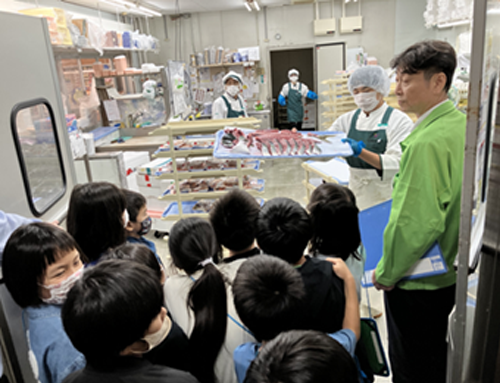 5ADAYの意味とは何か、一日にどれくらいの野菜を食べたらいいのか、栄養士の先生のお話からしっかり学んでいました。普段入ることのできないバックルーム見学では初めて目にするものばかりで、みんな興味津々で説明を聞いていました。